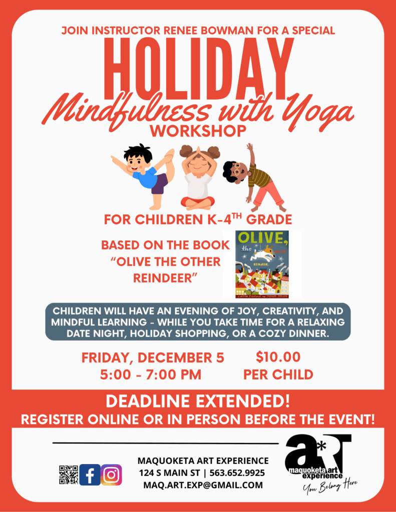 Join us for a Holiday Mindfulness with Yoga Workshop designed to spark creativity, confidence, and calm for children in grades K–4. This engaging session blends movement, art, and mindfulness practices in a festive, kid-friendly way.