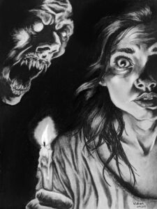 Forrest and Nolan have an affinity for the spooky, celebrating their marriage on Halloween Day. Both artists are self taught. Nolan will primarily display charcoal and colored pencil pieces. Forrest will focus on oil pastel, graphite, and other materials.